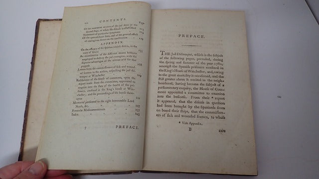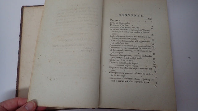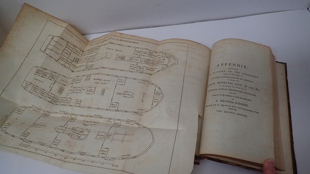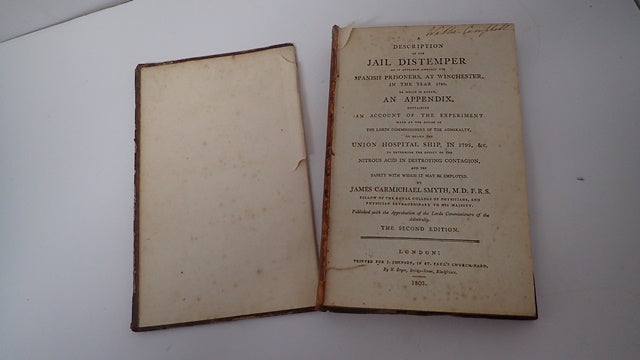 Sir James Carmichael-Smyth, 1st Baronet, KCH, CB (22 February 1779 - 4 March 1838) was a British Army officer and Colonial Administrator. Brown half leather boards with gilt lettering to spine. Boards are marked. Front board is detached. Corners are bumped and worn exposing the board beneath. Board edges are rubbed. Spine has bumping to ends. Front endpages are torn. Some foxing to both endpages and occasionally throughout. Previous owner's mark to FEP and title page. 248 pp - a Description of the Jail Distemper as it appeared Amongst the Spanish Prisoners, at Winchester, in the year 1780; iv pp - Appendix Containing an Account of the Experiment made at the Desire of The Lords Commissioners of the Admiralty on Board the Union Hospital Ship, in 1795 &c to Determine the Effect of the Nitrous Acid in Destroying Contagion and the Safety with which it may be Employed by A Menzies, Surgeon; 109 pp Report of the Experiment made with Nitrous Acid for Stopping the Progress of Contagion, as Executed on Board the Union Hospital Ship, at Sheerness by Mr Arch Menzies, surgeon. 2 pullouts. When securely packed this item will weigh in the region of 595g. (YBP Ref: 014593:1-G3)