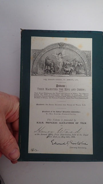 Green leather boards with gilt lettering to spine. Top edge gilt. One or two minor marks to boards. Corners are bumped, edges are worn. Spine is faded with bumping to ends; tear has been repaired. Endpages are a little grubby. B/w frontispiece. Textblock is in good condition, clean and tight. 277 pp + adverts. Bookplate declaring that 'This volume is presented by HRH Princess Alexander of Teck to Henry Ward'. Additional photos are available upon request. When securely packed this item will weigh in the region of 539g. (YBP Ref: 028885:1-R3)