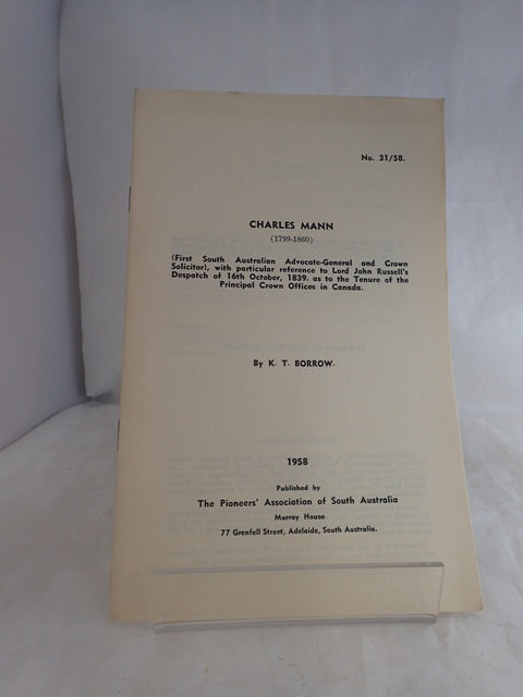 Pioneers' Pamphlet 31/58: Charles Mann (1799-1860) (First South Australian Advocate-General and Crown Solicitor), with Particular Reference to Lord John Russell's Despatch of 16th October 1839 as to the Tenure of the Principal Crown Offices in Canada