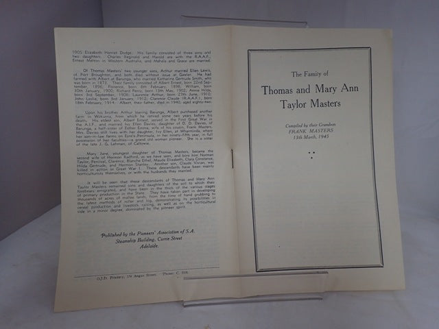 Pioneers' Pamphlet 13th March 1945: The Family of Thomas and Mary Ann Taylor Masters