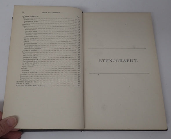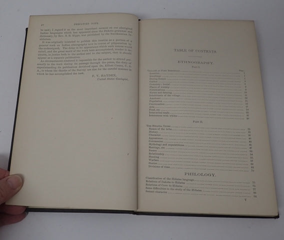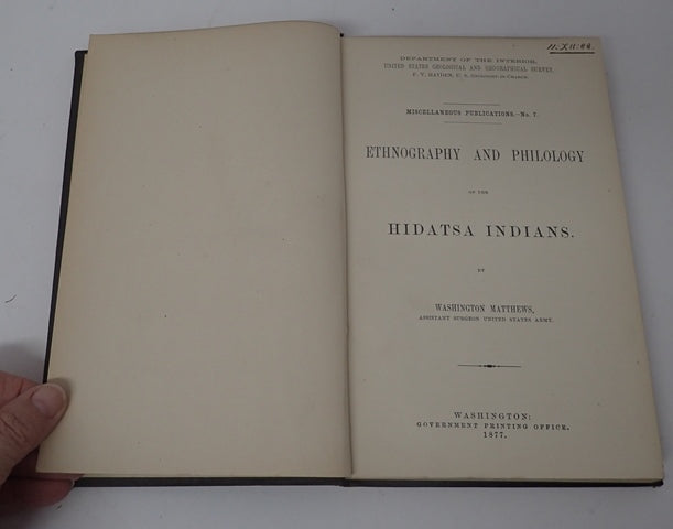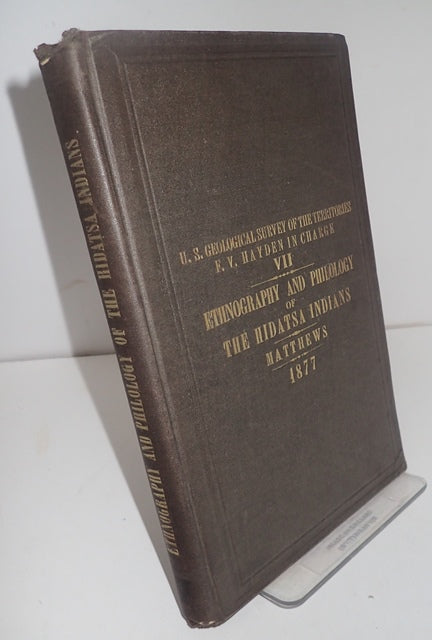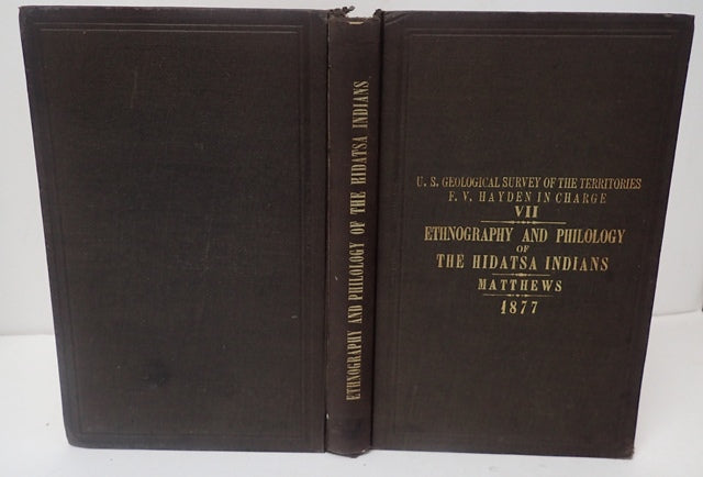 Department of the Interior, United States Geological and Geographical Survey. Miscellaneous Publications - No 7. Brown cloth boards with gilt lettering to spine and front. Boards have marks commensurate with age. Corners are bumped, edges are worn. Spine is a little age darkened with bumping to ends. Very mild foxing to the page edges. Text block is tanned, but generally clean. Contains the usual marks of an ex-library copy (Courtney Library). Pagination: vi, 239pp (125-209 are Hidatsa dictionary, 213-239 are Hidatsa-English vocabulary). Washington Matthews (1843-1905) was an Army surgeon stationed at Fort Union in present-day Montana in 1865. During his time there, he developed a lasting interest in Native American cultures and languages. Between 1865 and 1872, he served at several forts in Dakota territory, including Ford Berthold, Fort Stevenson, Fort Rice, and Fort Bulford. While stationed at Fort Berthold, Matthews became fluent in the Hidatsa language and authored a series of works detailing their culture and language. Additional photos are available upon request. When securely packed this item will weigh in the region of 692g. (YBP Ref: 034814:14h)